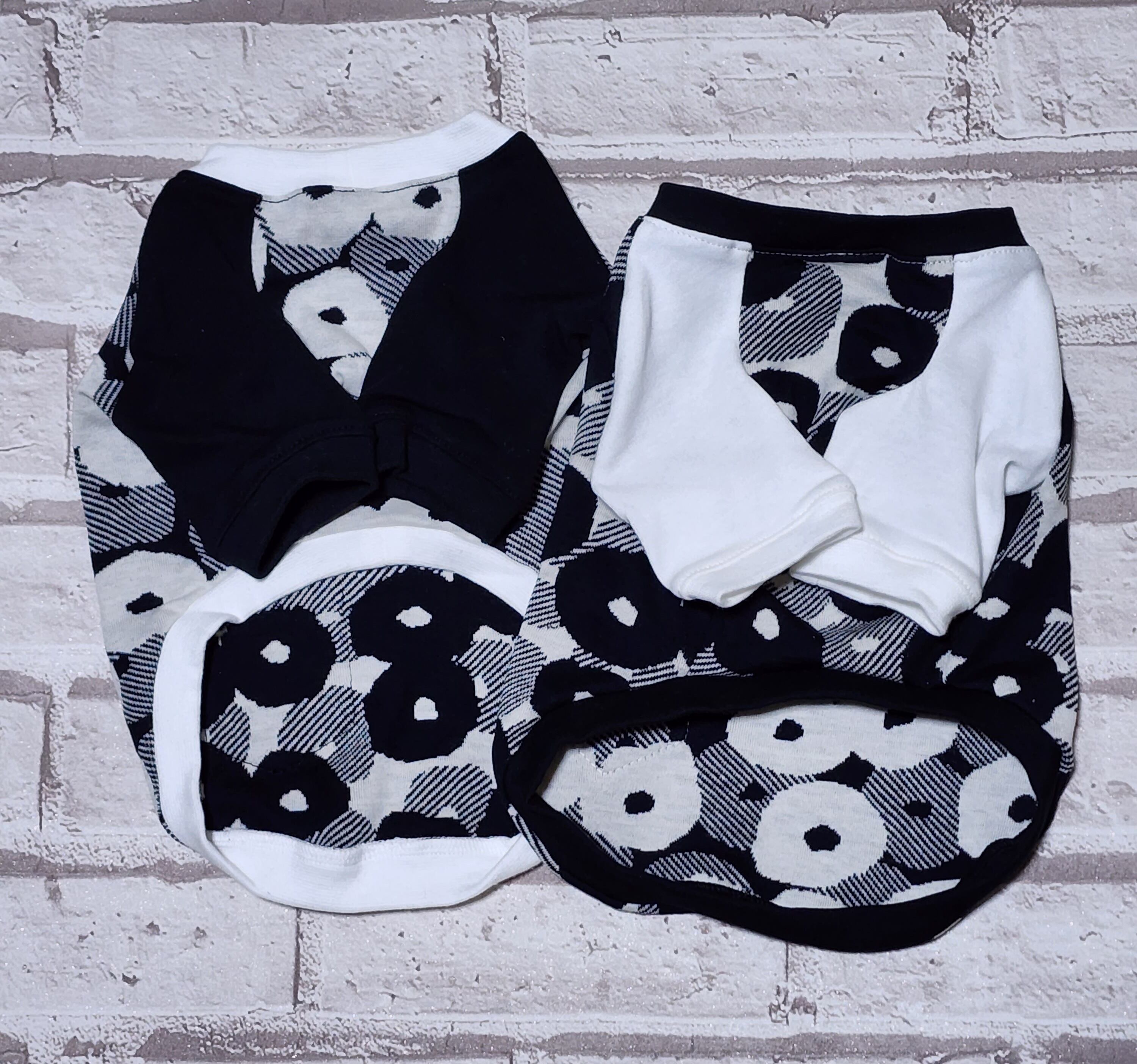 ▪️デイジードット柄のボディに無地の袖をつけ同色の小さいポケットをポイントに首と裾のリブは袖のバイカラーを使い、人気のあるモノトーンでモード感のあるTシャツをmotherly⭐︎dogオリジナルで作りました。